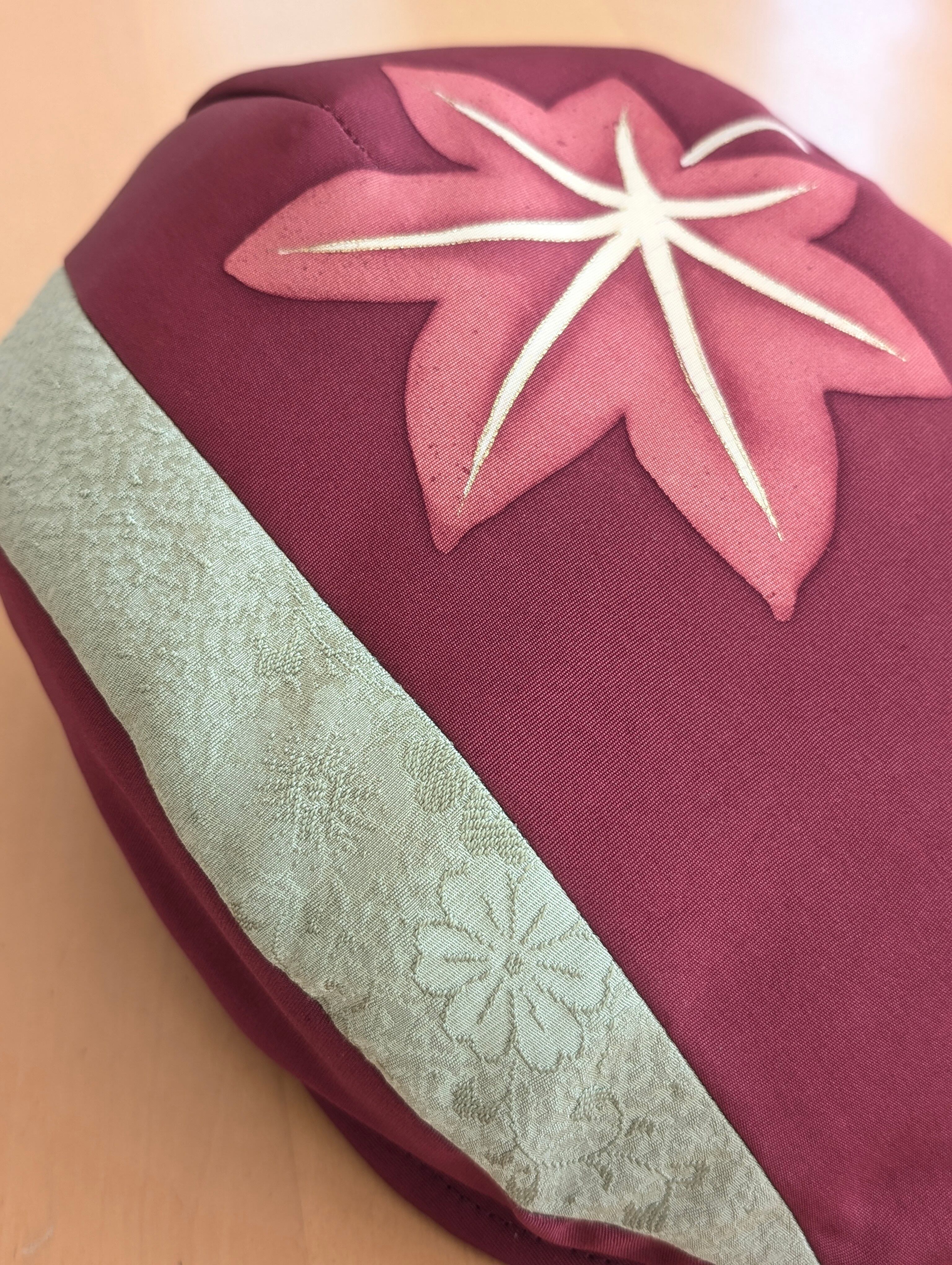 小豆色の地色に紅葉と青葉が描かれています。