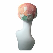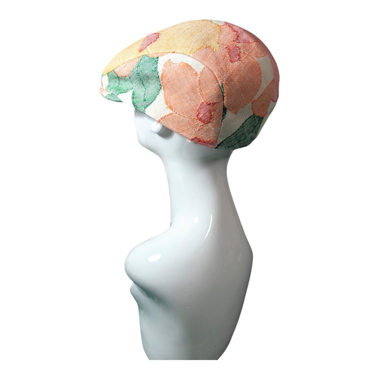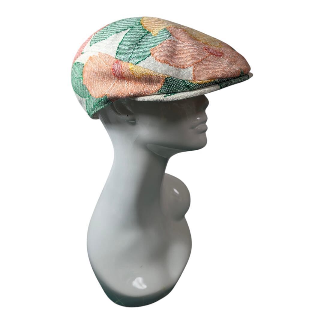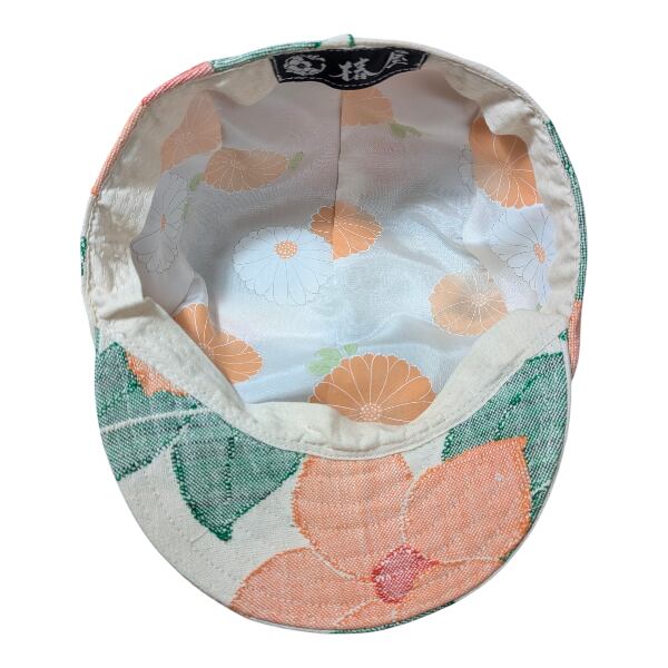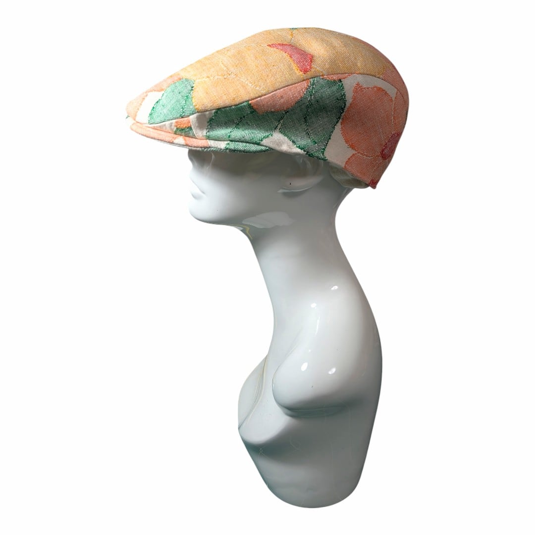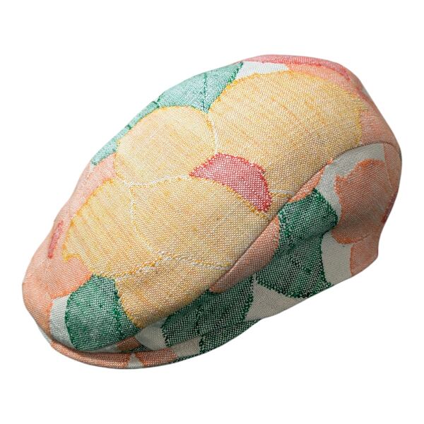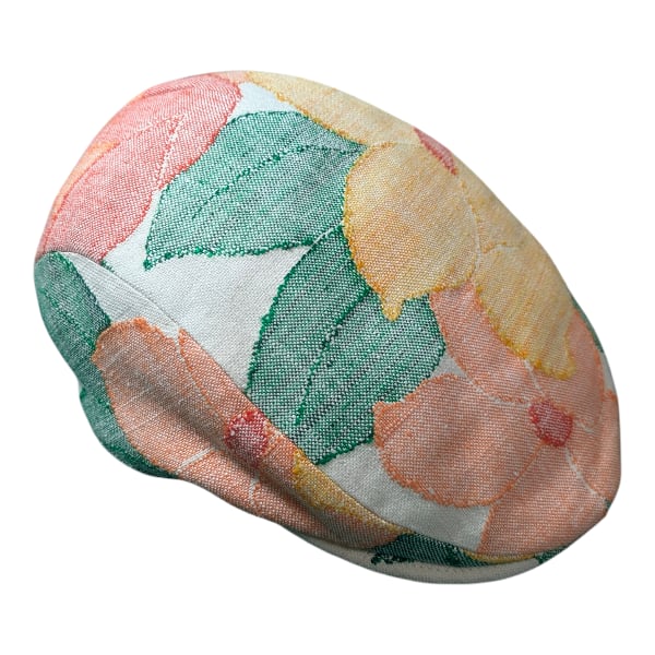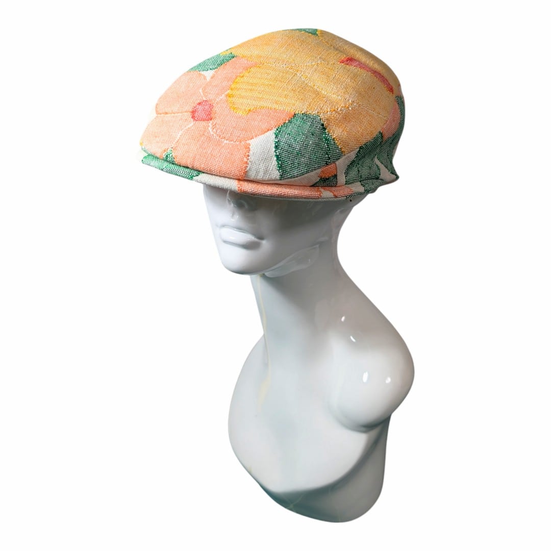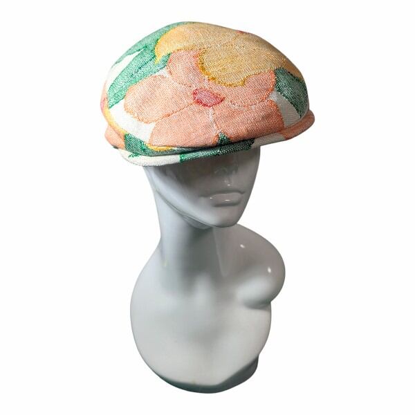 赤・黄・オレンジの花模様の帯をリメイクしたハンチング帽です。