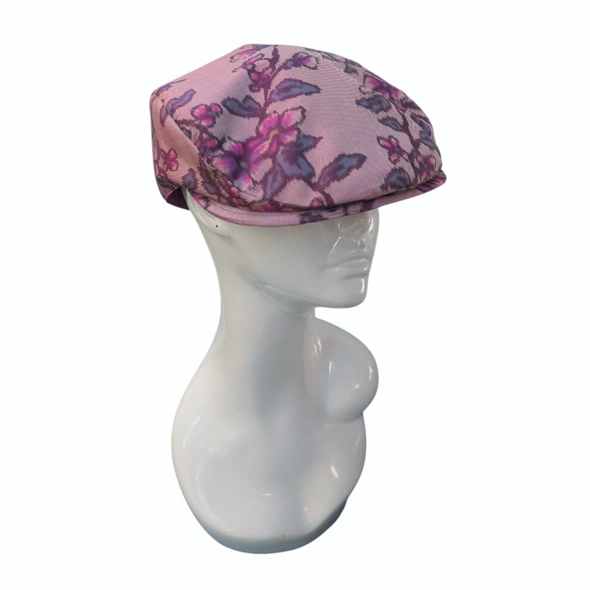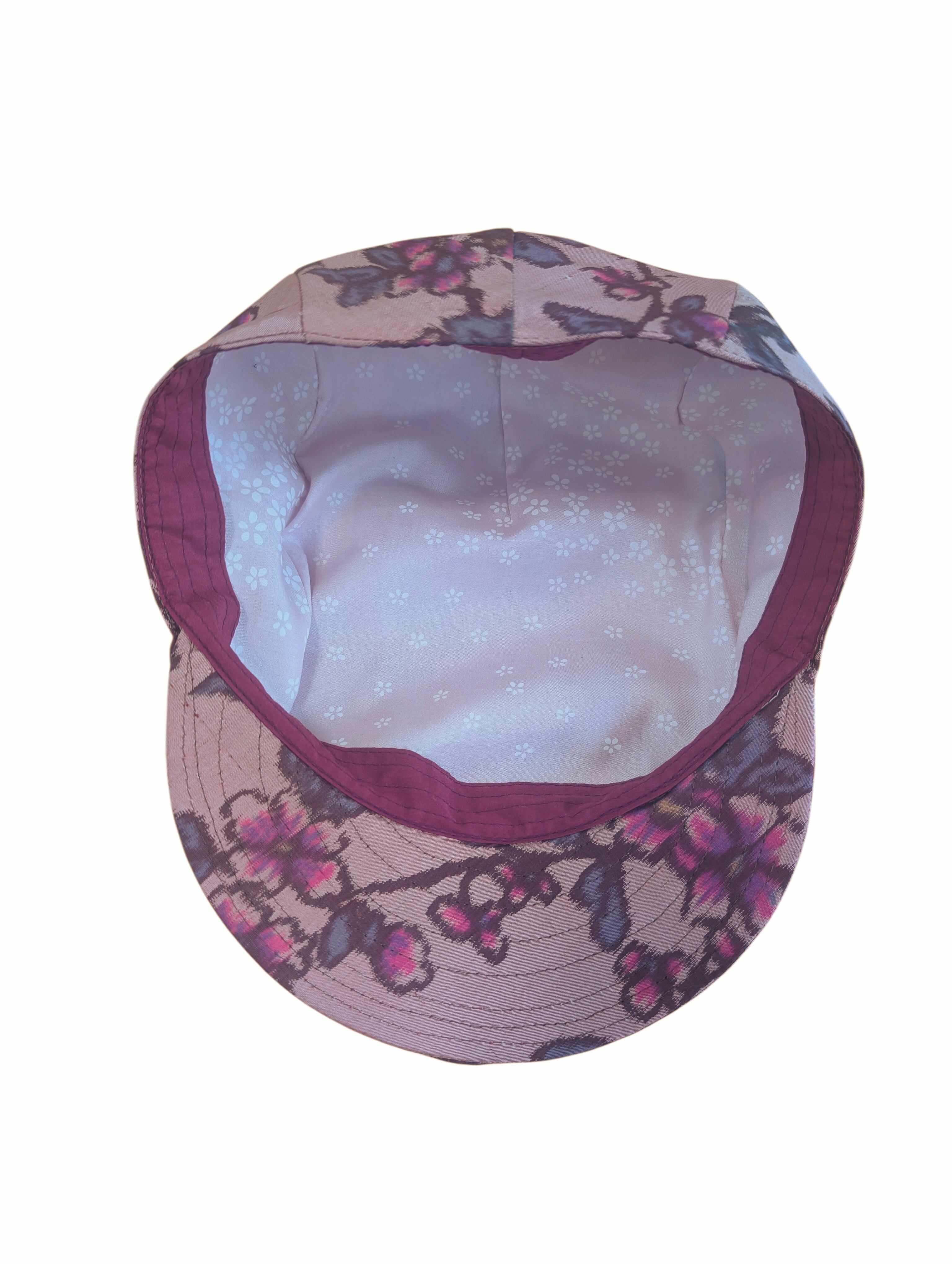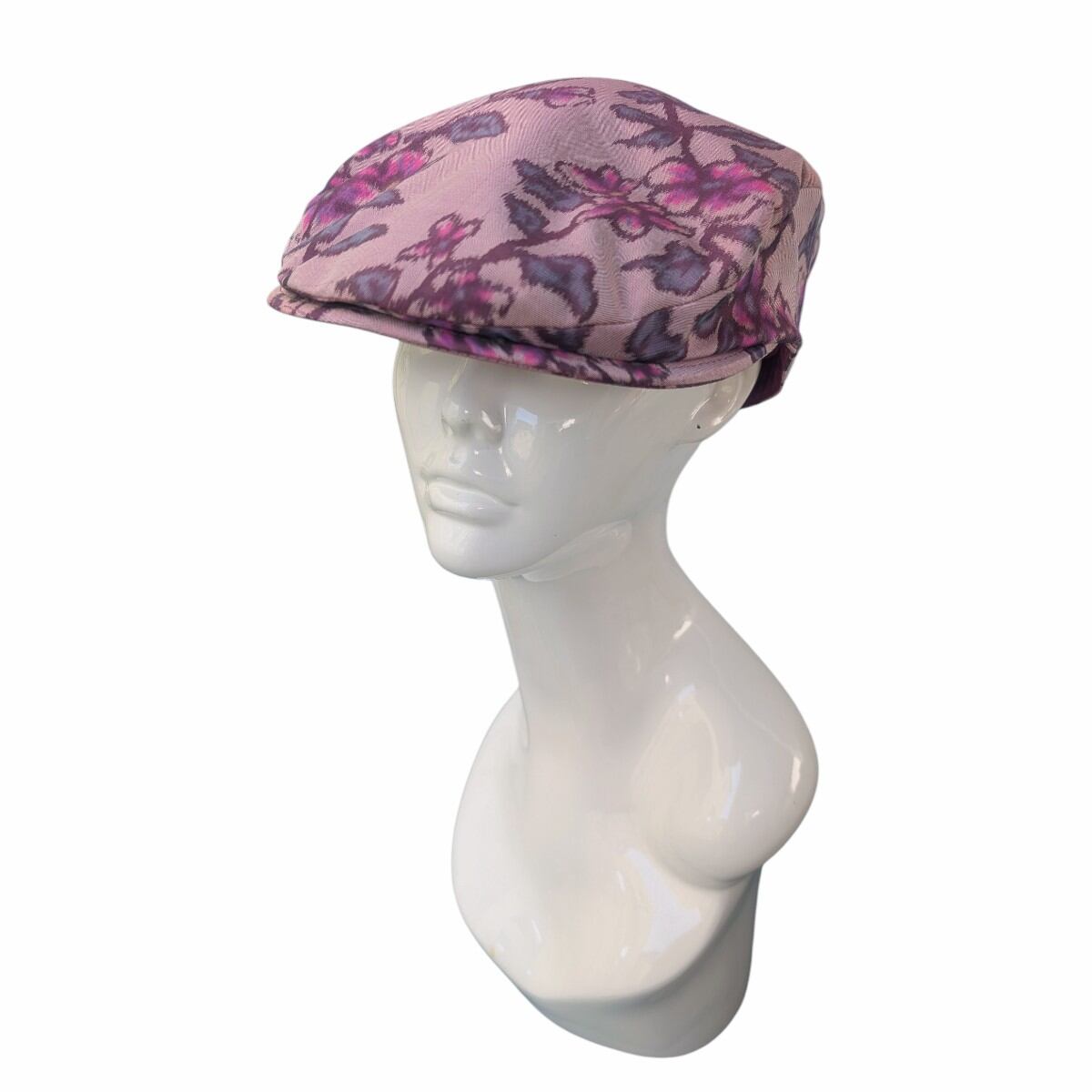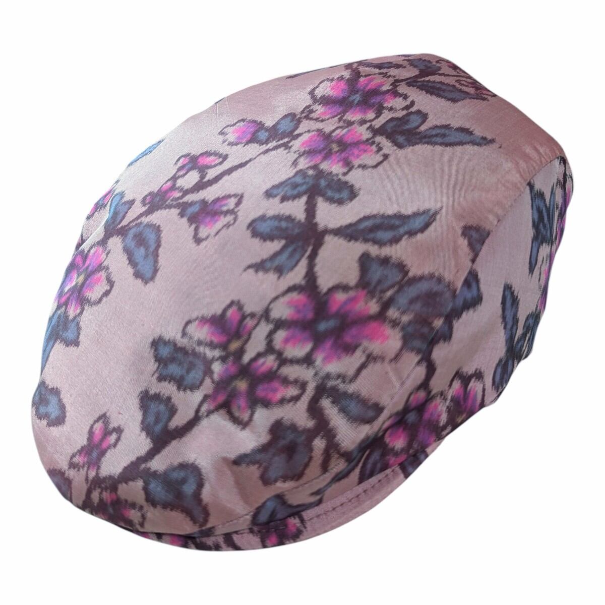 桜やプラムの花のような柄の銘仙の着物をリメイクしたハンチング帽です。