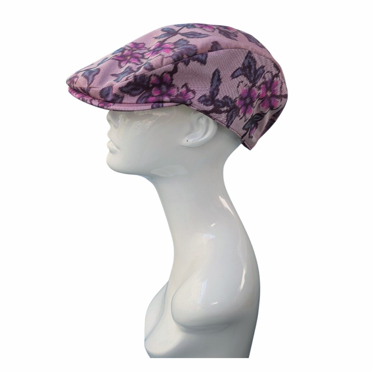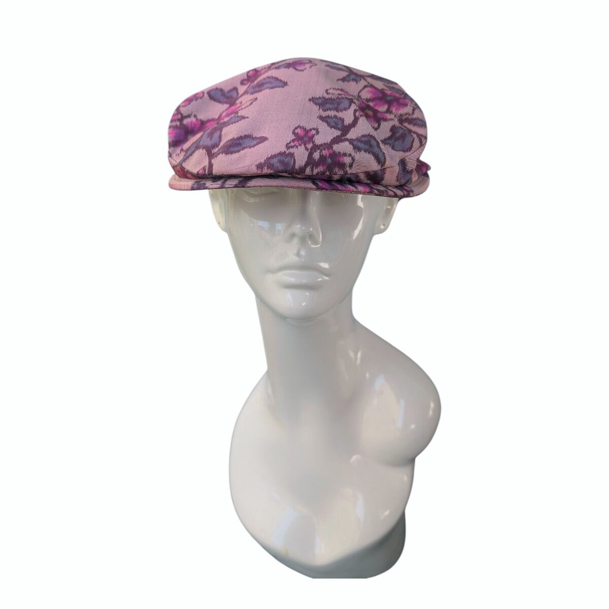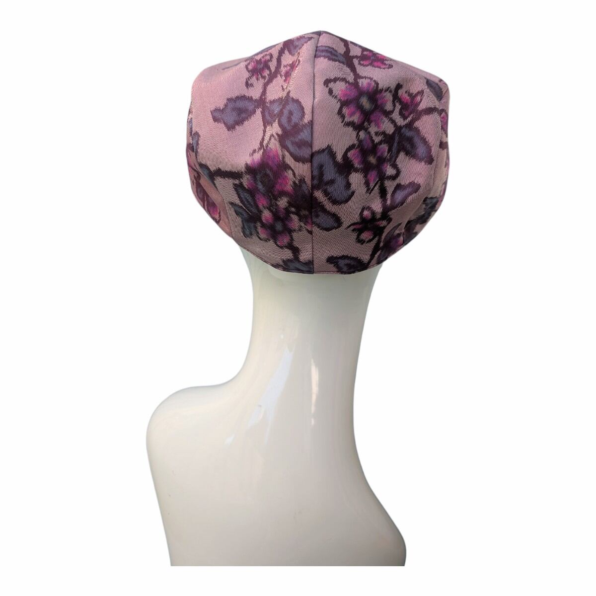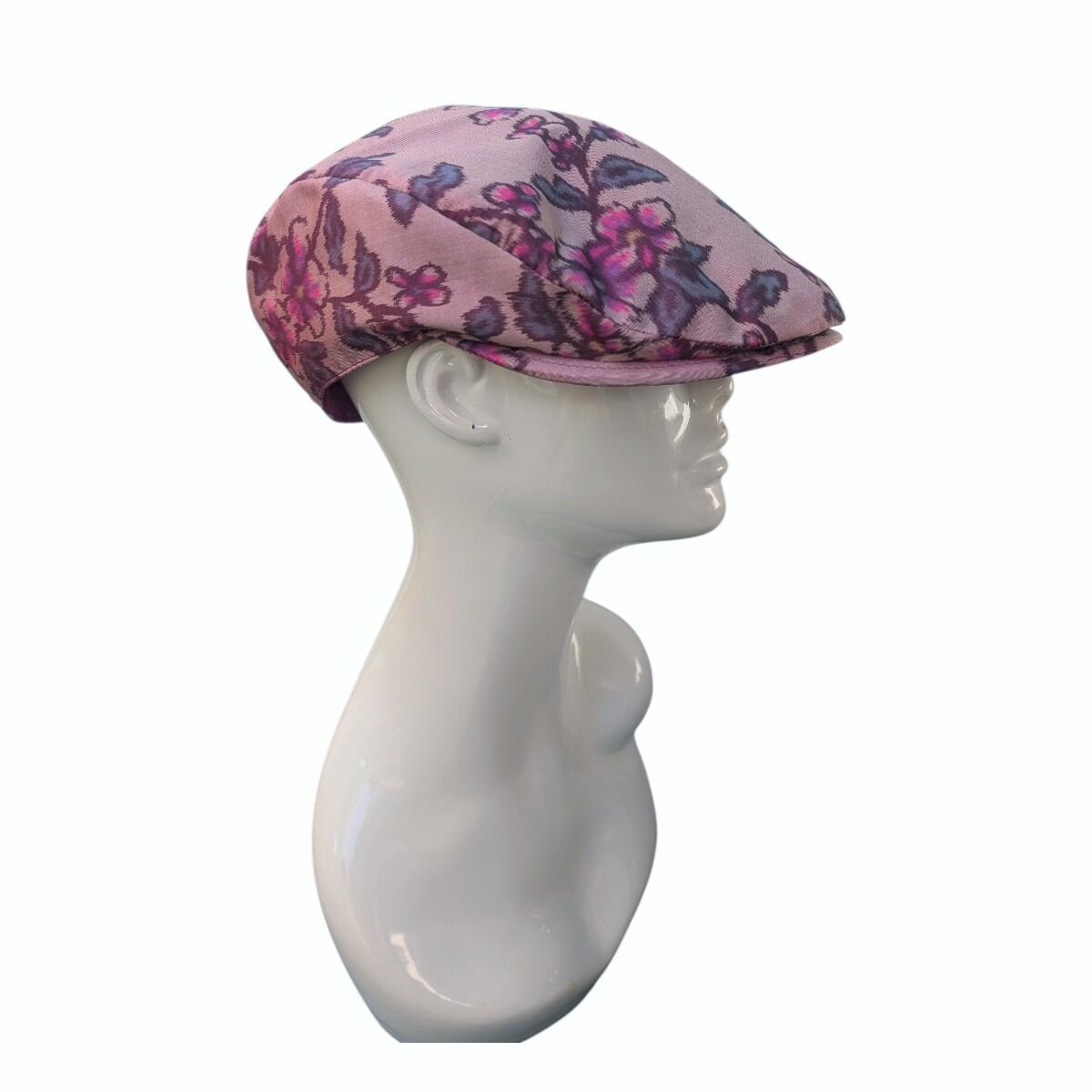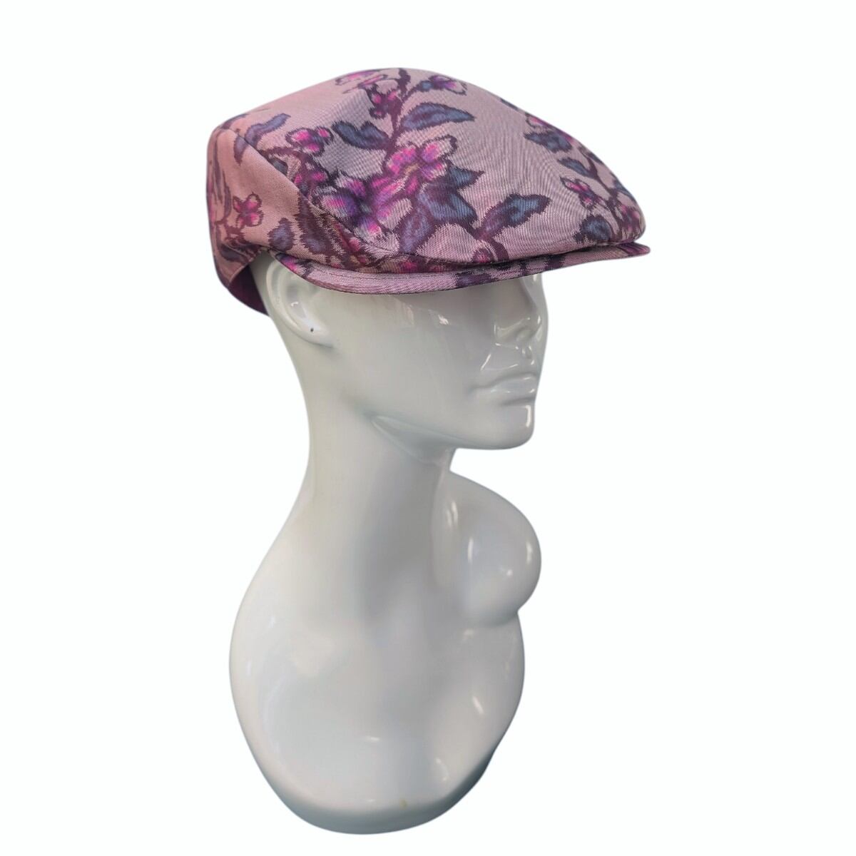 桜やプラムの花のような柄の銘仙の着物をリメイクしたハンチング帽です。